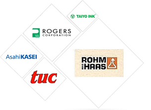 羅門哈斯電鍍藥水、日立干膜(線路)、太陽油墨(阻焊、文字)。